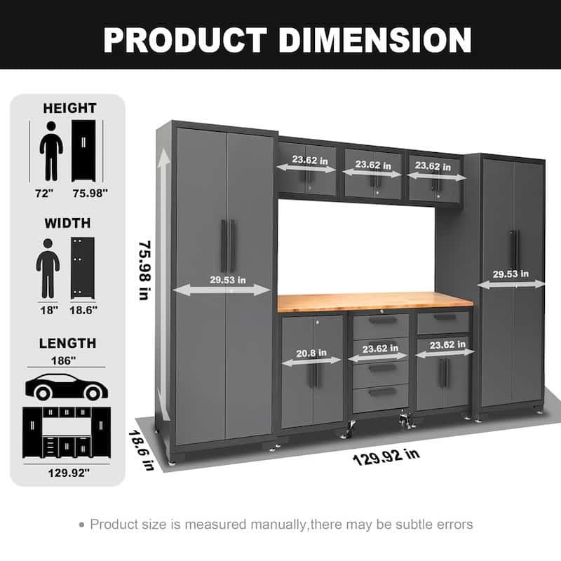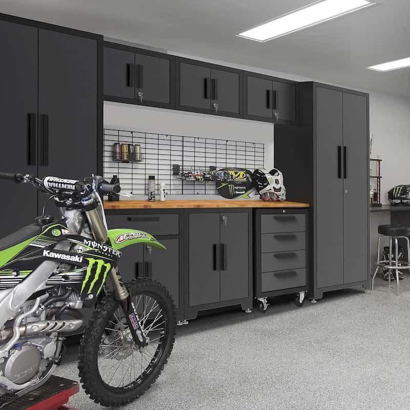The steel surface has a powder-coated finish. It resists scratches and stains. The set comes with a 1-inch thick wood worktop. You can use it for tools and projects. One end of the worktop is supported by the tall cabinet.