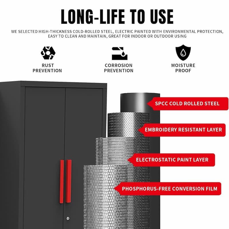 The cabinets are made from 100% cold-rolled steel. The steel is 0.8mm thick. All cabinets are fully welded for strength. They come with locks for safety. The surface has a special coating which can resist scratches and wear. These cabinets are strong, safe, and long-lasting.