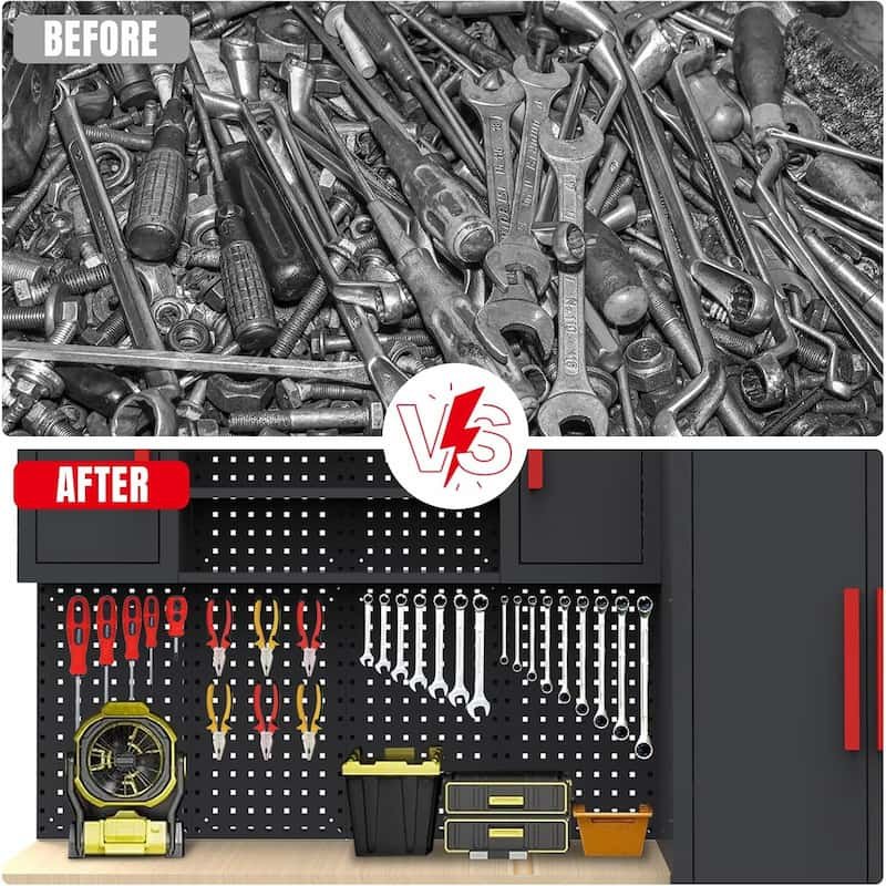 Use the pegboards to hang tools and small items. They work with standard 1/4″ and 1/8″ hooks, bins, and accessories. The pegboards are much stronger than regular ones. They have a powder-coated finish that resists rust and cracks. Therefore, they help keep your garage or workshop organized.
